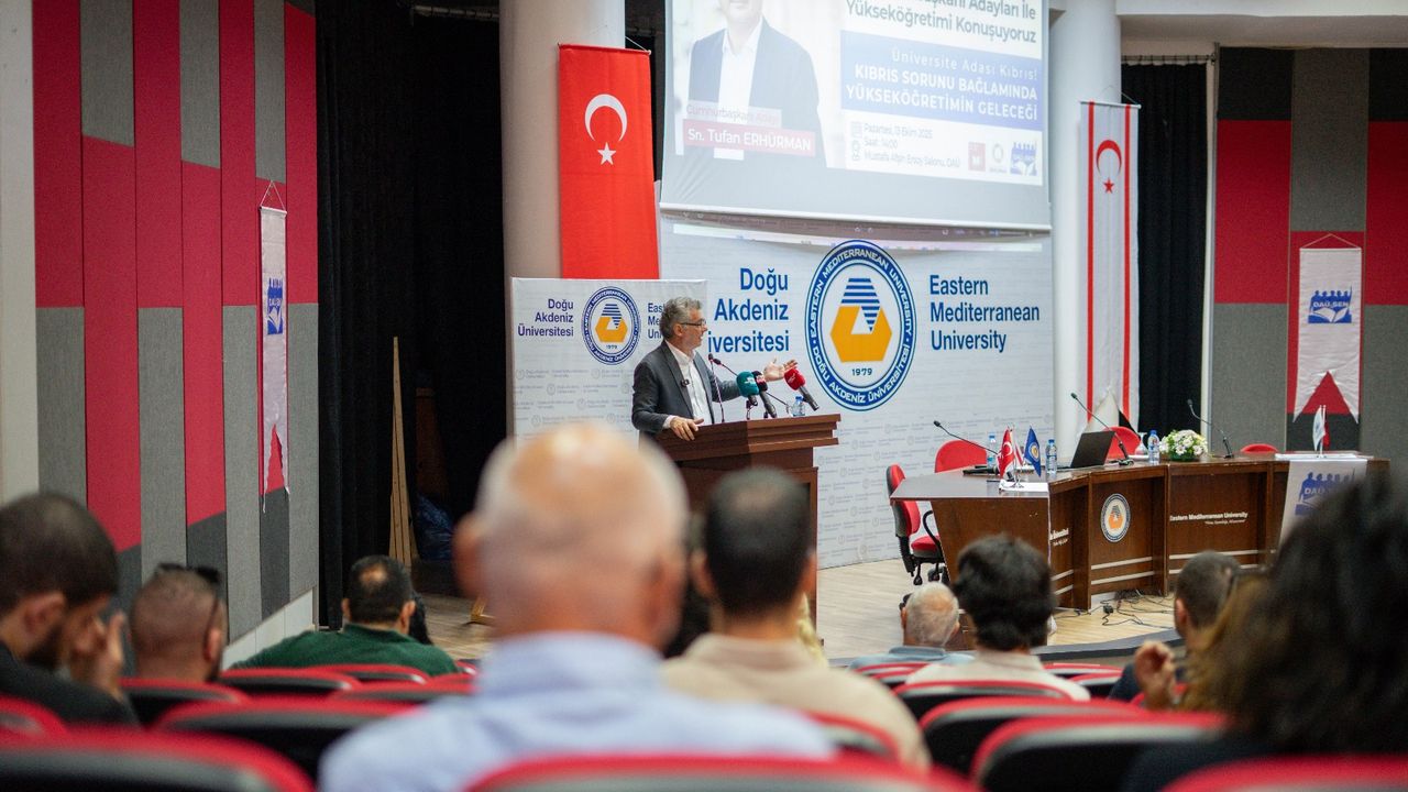 Doğu Akdeniz Üniversitesi Akademik Personel Sendikası (DAÜ-SEN) tarafından düzenlenen “Cumhurbaşkanı Adayları ile Yükseköğretimi Konuşuyoruz” etkinliği kapsamında Cumhurbaşkanı adayı Tufan Erhürman, akademisyenler ve öğrencilerle bir araya geldi. Etkinlikte “Kıbrıs Sorunu Bağlamında Yükseköğretimin Geleceği” başlıklı bir konuşma yapan Cumhuriyetçi Türk Partisi (CTP) Genel Başkanı ve Cumhurbaşkanı adayı Tufan Erhürman, öngörülebilir ve güvenli ortamın önemine işaret etti. Erhürman, “20 Ekim itibariyle gözüm kulağım kesinlikle üniversiteler alanının üzerinde olacak” dedi ve söz konusu alanda kendini ispatlamış herkesle birlikte cumhurbaşkanlığının, üniversitelerle ilgili çok aktif bir çalışma alanı içerisinde olacağını belirtti. Söyleşide ayrıca, DAÜ-SEN Başkanı Ercan Hoşkara da konuşma gerçekleştirdi ve Tufan Erhürman’a etkinliğe katıldığı için teşekkür etti.
