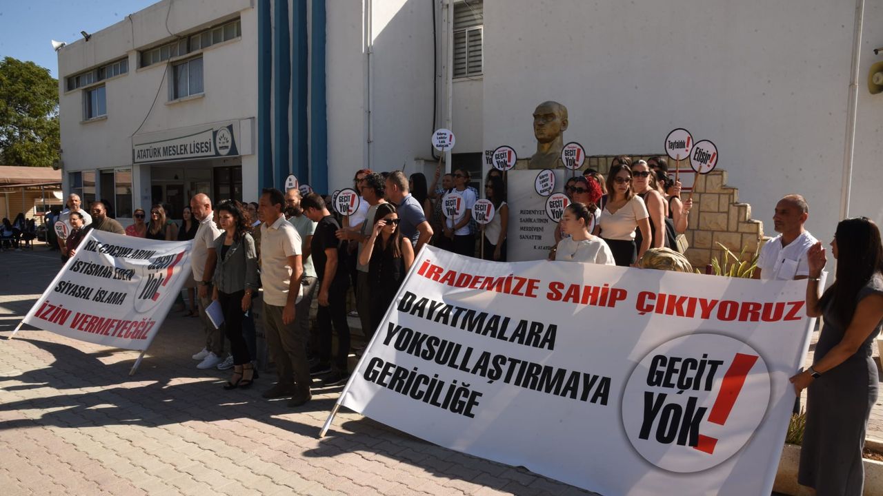 Eylemde, “İrademize sahip çıkıyoruz. Dayatmalara, yoksullaştırmaya, gericiliğe geçit yok”, “Kız çocuklarını istismar eden siyasal İslam’a izin vermeyeceğiz” yazılı pankartları açıldı; “Kıbrıs laiktir, laik kalacak”, “Geçit yok”, “Etişir”, “Tayfaldık” yazılı dövizler taşındı.